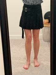 Structured, smart and kind of edgy skirt. Well made and designed with thicker material. It was a bit short for my taste (I am 5'8") BUT wore with thick tights and tall boots. It also stays put because it is a thicker, structured material.