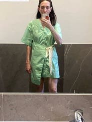 This is hideous. It feels like wearing scrubs but as a dress. It’s silly, papery feeling and just a hard pass.
