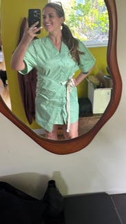 This dress looks a little bit like nursing scrubs 🤣 but on its quite cute with the asymmetrical tie and it's a good length, short but not indecent. (I'm 5'9 and size 10) Twas a bit big but not horrible Great for a girls' trip to Miami. I'd rent again!