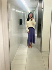 This skirt was soft, the mixed fabric was yummy, the color the perfect dusty purple, and I loved the asymmetrical cut. I wore it out on the town in NYC and then on vacation. Was able to mix and match with different tops, and wore it more than I thought I would! It is low rise/ the waist is bigger than expected but the look really worked and it’s great for long torsos! Stay true to size or size down for this one.