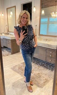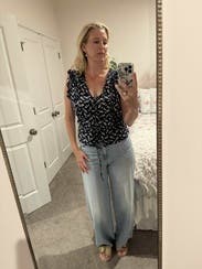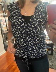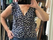 Feminine ruffles; a bit a cleavage; would have preferred a longer length. I like roomier tops so I size up.