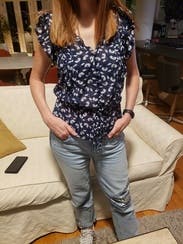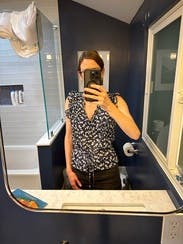 Nice top for video calls and everyday wear to throw on top of jeans or pants. It’s a printed cotton top that’s a safe and easy option.