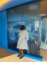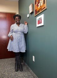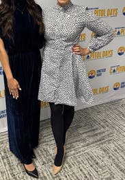 Liked the design on my shape. Like the material. Static was causing it to stick to my panty hose so I found myself having to adjust it down when I stood up/walked. I didn’t wear shape-wear; I think I should have. I didn’t like the design of the collar on me; I pinned it down to appear like a blouse. The description says floral but it’s not overwhelming; from afar they could be polka dots. Could easily be dressed down.