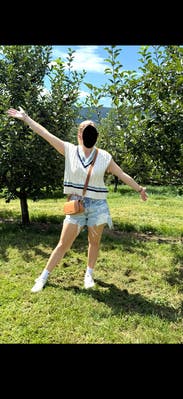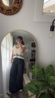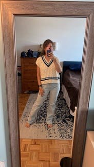 I love this sweater vest cause it is thick enough that you can get away with just wearing it and nothing under it (super nice for summer) or dress it up and throw a turtleneck on under it. It runs a little big I would say and it’s easy to lose shape in it, but if that’s not a big deal for you, it’s a great fit I’d say!