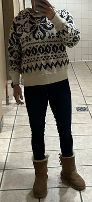 Perfect sweatshirt for the winter. The inside lining of the sweatshirt is so soft! Cozy, cute with an adorable fair isle pattern. Love it!