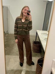 Great, comfortable sweater. I wore it over a long sleeved cotton tee and with olive green corduroy pants. Would rent again and would consider buying.