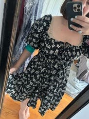 Black floral cotton (100% Cotton Plain Weave Printed). Hourglass. Short sleeves. Square neck. Pull on. Imported.