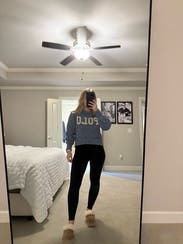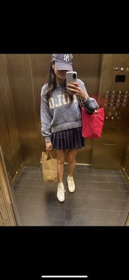 This is cute but I shouldn't have sized up. I love a cozy and baggy look, but it looked awkward because the length is a bit short but the arms and waist were really big. It was warm and not too itchy.