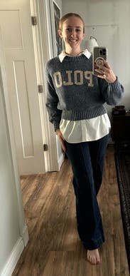 Minimalist Polo Sweater- Great sweater, is a medium weight so can be worn in spring, summer and fall, depending on how cold it gets. Wore at night over dresses and jumpsuits and kept me warm during April/May timeframe.