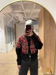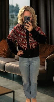 Cozy fairisle winter cardi! I am a true size small in tops and went with the small here and it fit TTS- on the chillier days for those looking to layer it fit relatively snug and wouldn’t allow for much room to layer a long sleeve tee underneath. For a chunkier oversized look, I’d recommend sizing up one size, but for a fitted look and to wear this as a top on its own I’d take your true size. I’m petite and this hits ever so slightly below my hips, so has a little bit of a cropped feel to it. Not itchy at all, but definitely a thicker wool material. This is a perfect cardi to grab for a weekend upstate or on the mountains!