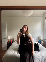 I absolutely loved this vest. It was fun to style and was perfect as a top, flattering without showing too much cleavage, which sometimes happens with vests. Can't wait until the weather cools off again so I can rent!