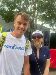 This is a little heavier material than I expected, so very warm on a 95 degree day in DC! But perfect outfit for a tennis open, pictured with Holger Rune here. :)