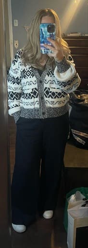 It is cropped and thick, so not super flattering but a fun winter design. Good for WFH calls.