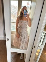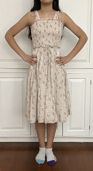 The length of the smocked bodice was too long for me; an empire waist would have been much more flattering. I liked the spaghetti straps & the pockets, as well as the length of the dress, just didn’t care for where the waist line hit