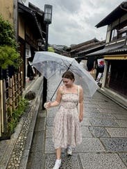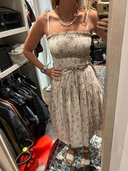 Super easy to wear and pack dress. Love the feminine tie straps. Could also tuck in and wear strapless. The waist also ties tighter if you want to really cinch it. Also rented the skirt in this print!