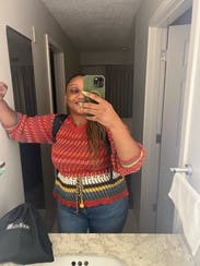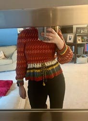 This is my 2nd time renting this sweater. I love that this sweater has a beautiful classic style but also makes you feel so very sexy. The color combination is on point, gives a 70's vibe but still feeling fresh and new. My first rental was last Dec, I wore it to a game night with friends, I also wore it on a date and to work. Back then I rented a large and I will admit I could have gone down a size. Since then I have lost some weight, so I rented a small and it fit perfectly. If you are thinking of renting this sweater, stop thinking and just go ahead click "Add to Bag", I promise you...you will not regret it. I would purchase this sweater if not for the price, even on sale at the moment, I'm not able to pull it off, but the moment I can, I will purchase it!