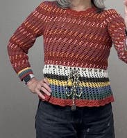 This sweater is so cute. It is colorful and has a shape. Love the drawstring that gives you a waist. You won't be disapointed.