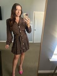 Easy fall work dress! Fits true to size. The belt is a little funky but nothing that a little fashion tape can’t fix!