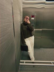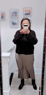 Thought about buying it but didn't. Turtleneck is high but the sweater is cozy. One night I wore it with jeans and another time with leather flares. Love how you can wear it differently.