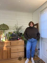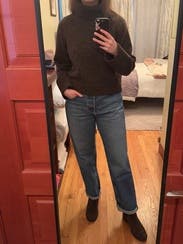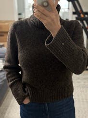I lived in this sweater, the chocolate brown, the tall turtleneck, the roomy middle, it was just so comfy, easy, and wearable. If I could afford it I would purchase this sweater!