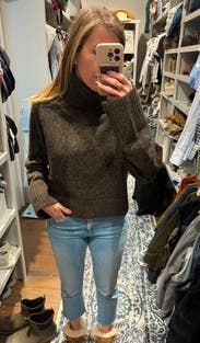 I adored this sweater - the chunky turtleneck is perfectly structured. The knit in general is structured enough that it keeps its shape like new after a couple wears, but is also not scratchy or uncomfortable. Sleeves are a great length for tall girls, length of the torso is very slightly cropped - I have a longer torso and it hit right at the top of my hips - it fell nicely with high-waisted pants. Will definitely rent again when the weather is chilly again!