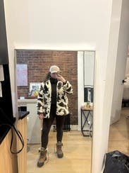Wanted to purchase but a little too pricey! Super warm, perfect for Chicago winters. Since it's cropped, the bottom is a little open so it gives some nice airflow. Tuck it into the front of some jeans for a more flattering look.