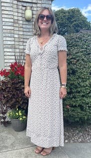 Loved the feel of this fabric. Perfect for a summer dinner. The light color was not the most flattering on me but would be great on darker skin tones. And the small floral print is so lovely. The tie back lets adjust the look too.