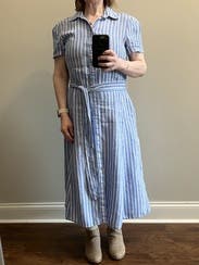 This is a perfect summer dress — lightweight, comfortable, and flattering with classic blue and white stripes. It has generous pockets as a bonus. Some reviews mentioned problems with the fit of the chest and/or sleeves, but it fit me perfectly, perhaps because I have wide shoulders. It’s a little wrinkle-prone since it’s linen, but fine after steaming.