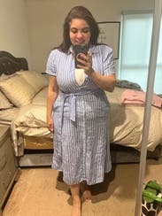 Loved this dress. It was super light weight but it also wrinkled really easily. It has pockets and I safety pin the bust so it wouldn’t gape.