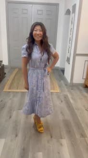 Flattering shape | Lightweight material | Tight in the arms | Opens at the chest when sitting down | Good length for petites | Wrinkles | Would size up | Overall good summer dress!