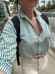 Very tempted to buy this button down. Loved the fabric and the green stripes. Can dress up for work or down for casual fun.