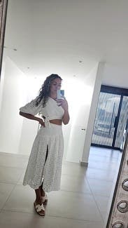 I absolutely love this eyelet material dress for the summer! ☀️ The xs fits me perfectly, though I do wish the slit wasn't quite as high up. However, that's not a big deal—a small pin can easily take care of that! The way the skirt flows and sways as you walk makes this such a fun dress for dancing!