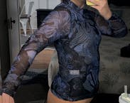This Prabal Gurung Collective top features a bold, artistic print on a sheer fabric with a high neckline and long sleeves. It presents a sophisticated yet edgy aesthetic. Pair it with a sleek leather skirt and statement heels for a modern, fashion-forward look.
