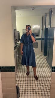 Beautiful dress, very work appropriate. Got tons of compliments. I got a size 4 which fit everywhere but I have a wider ribcage and there was a little bit of gapping near the bust. Dress is so well done, light enough denim for summertime. Wore it indoors only, it would probably be too hot for an 80 degree summer. I wore it with birkenstock sandals. I would definitely rent again, maybe for an event!