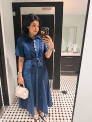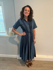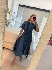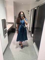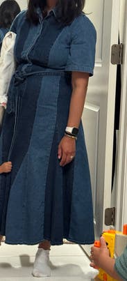 I love this style! One of my faves! So flattering and I love the mixed blues in the denim! The size I rented fit me perfectly. I love a tie waist as it adds shape to my little frame. A little heavy material but that’s expected with denim and it is very comfortable. Can dress up or down. It was longer than expected but I didn’t mind at all and I’m short so most dresses are longer on me than on others anyway. Wore to a religious event but I would wear this anywhere!