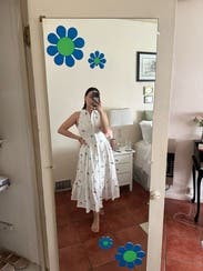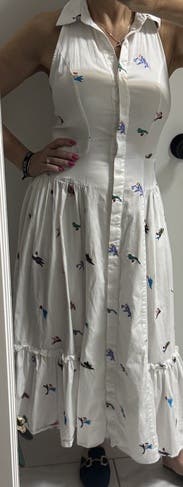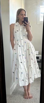 This dress is so stunning. Got several compliments on and can be dressed up or down, with sneakers, heals or sandals. The embroidery was slightly itchy. The fit is just right and very flattering in the waist. Pockets always a bonus. But must wear a racerback/strapless bra which I find annoying. But didn't stop me from wearing several times during rental. Would definitely rent again.