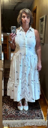 This dress is really pretty. It is a summer dress and is cut narrow through the shoulders so I wore a sweater with it to work. That worked anyway with the AC there. It’s a great summer dress. The embroidery is really pretty. Just be prepared to iron it before you wear it. Another one I received a lot of compliments on.