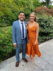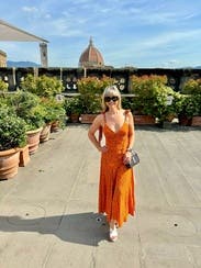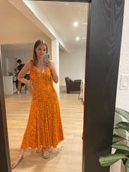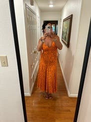 This dress is an absolutely stunning color combo of bright orange and subtle blue accents! It was easy and breezy to wear in a tropical environment for a wedding. I was able to look great and feel comfortable dancing. I would HIGHLY recommend. My absolute favorite piece from RTR so far. I was worried about the strap fringe being weird but I just threw both parts in the back and they stayed there looking cute. The body is not as tight fitting as some may like and it was a bit longer in the body and I have a long torso. I could see this not being for everyone given those concerns, but I loved wearing this dress and would definitely rent again.