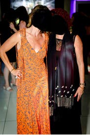 Orange printed viscose (100% Viscose). Hourglass. Sleeveless. V-neck. Back zipper closure. 42" from center front to hemline. Imported.