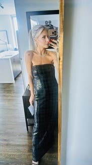 Obsessed with this dress!! Would wear again & again for formal occasions. Sized 1 size down since this is very flowy but tighter in the bodice, but this was perfect since it was strapless & I am not super large-chested.