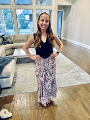 The skirt fit me more like a maxi since I'm short. It sat at my high waist, and there is no stretch to it. It was comfortable for all day wear, and although the fabric is a bit heavier and layered, the cut of it has slits/layers so it felt great on a hot summer day. The slits are also conservative - at least for us shorter people, you don't have to worry about showing off too much.