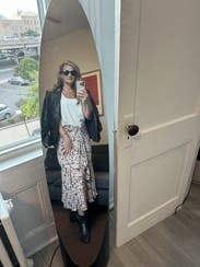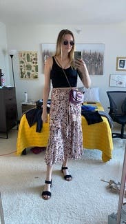 I typically don't like the way skirts look on me, but I really liked this one. the waistband dips in the front and the skirt fit well. I added a black turtleneck and boots to transition to fall.