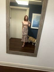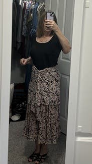 Photos don’t show how gorgeous this skirt flows. The piece of fabric that drapes under the rear would likely have shown more curve if I’d gone down a size. Fabric weight and pattern are really pretty. Light enough for summer but heavily layered so it could work for some colder seasons. 5’2” 150 lbs. Mid40s. Unfit. A little curvy & a little round. Longer torso. Shorter legs.
