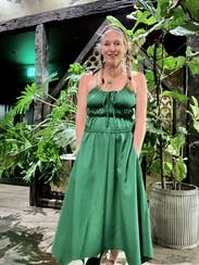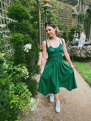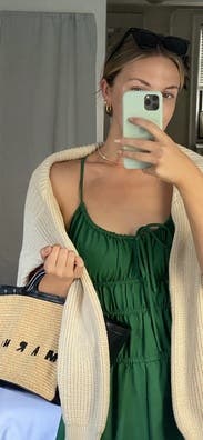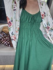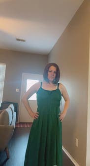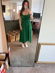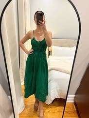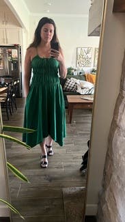 A perfect summer dress. Definitely runs big in the top, had to do some adjusting of the tied neckline to get it right. Such an easy dress to style and a gorgeous green color.