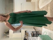 Beautiful bright green dress that's easy to wear! Very comfortable, and the elastic and ties allow for a flattering, adjustible fit. I've rented this dress a few times - it's easy to look put together and get lots of compliments! Fabric is on the thick side but lightweight and breathable; feels like soft cotton. True to size.