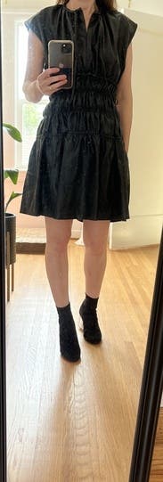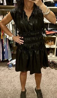 I loved this dress so much. I got it for a trip to Korea and it was perfect for fall weather. I wish I had more places to wear it! Surprisingly comfy for leather. Size 4 fit perfectly. My teenage daughter said I looked like a trash bag but my sister in law said that was way harsh Tai.