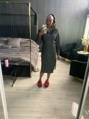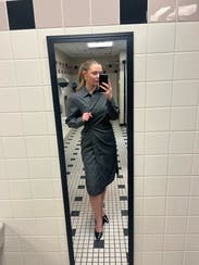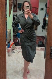 This dress is everything. It's classic and funky at the same time and deserves to be a staple wardrobe piece for any professional woman. To wear, I buttoned the first two buttons, then secured the wrap in the back. It gives such a lovely, flattering shape, highlighting the bust and the waist, which was amazing because I have a thicker waist. I do size up with wrap dresses for modesty. The slit and the wrap are modest enough, but I wore it with opaque tights. If I could afford this one, I'd buy it in a heartbeat. I hate sending it back but I need options for an upcoming event! I will definitely rent this one again.