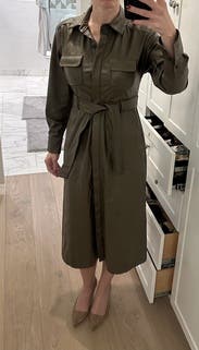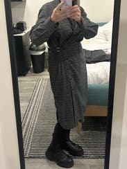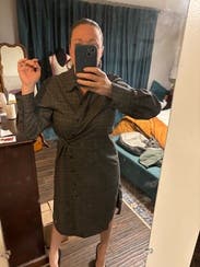 I really liked this one! Like others, I was confused about how to wear it at first. I ended up copying the model pics and just tying the belts at the back, not buttoning any buttons. I wore it to brunch on a rainy, 70 degree day and it was the perfect “not too hot, not too cold” piece to wear. Loved it with the boots!