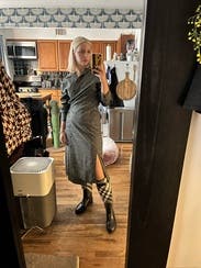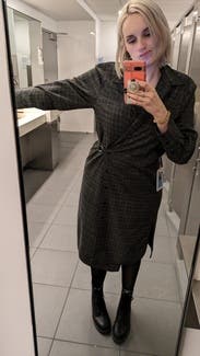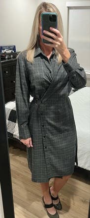 The asymmetric buttons make this fun, and I loved the wrap. The sleeves are a little large but the dress was otherwise perfect with tights and boots.
