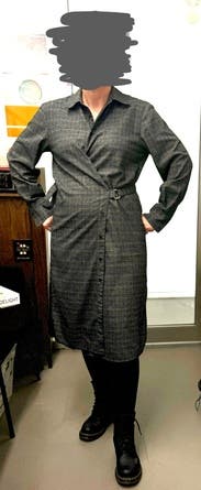 You have to get the wrap right: there are really only two buttons that are intended to function—they are at the top, and it twists from there. I belted it on the right side. The bottom half does not button so you will need to wear leggings, opaque tights, or a slip dress under. Good for work. Nice fabric, not scratchy. I wore w combat boots but would look good with heels too.
